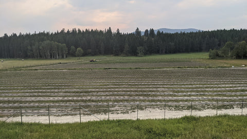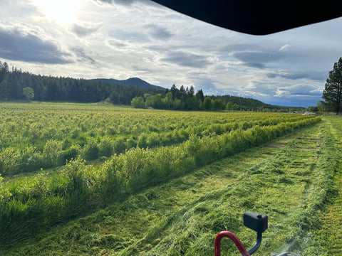 We trenched 8 miles of row and, using our feed mixer, carefully filled them with this rich, nutrient-dense soil. After leveling the ground, we drilled a cover crop into the tilled earth and established 8 miles of hedgerow with a field mulch layer that laid our drip lines as well. Then came the most labor-intensive steps in the summer of 2021, hand-cutting 10,000 holes and physically planting 10,000 honeyberry starts.